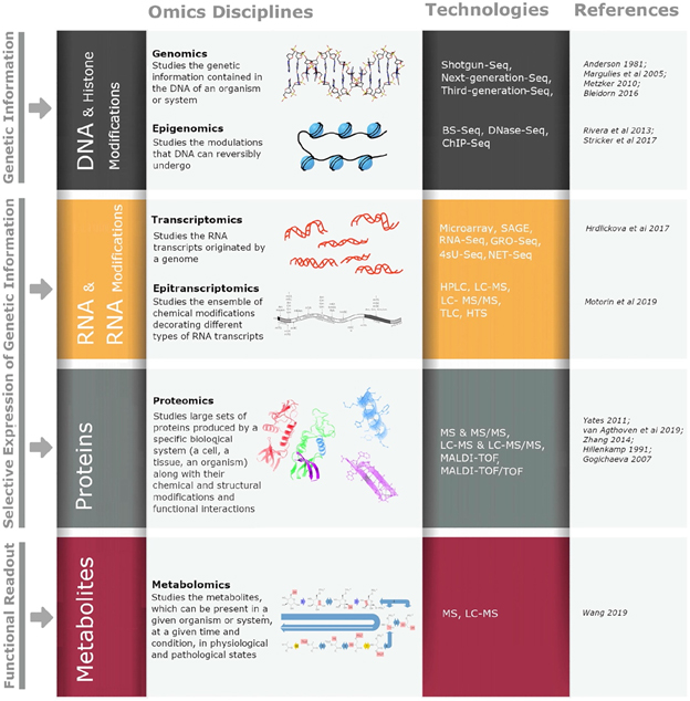 Transcriptomics looks at the RNA sequences produced directly from the DNA code and can identify all of the genes that are being expressed in a particular cell or tissue at that time. Metabolomics is something used every day in clinical medicine – you may know them as blood chemistries, cholesterol, cortisol.